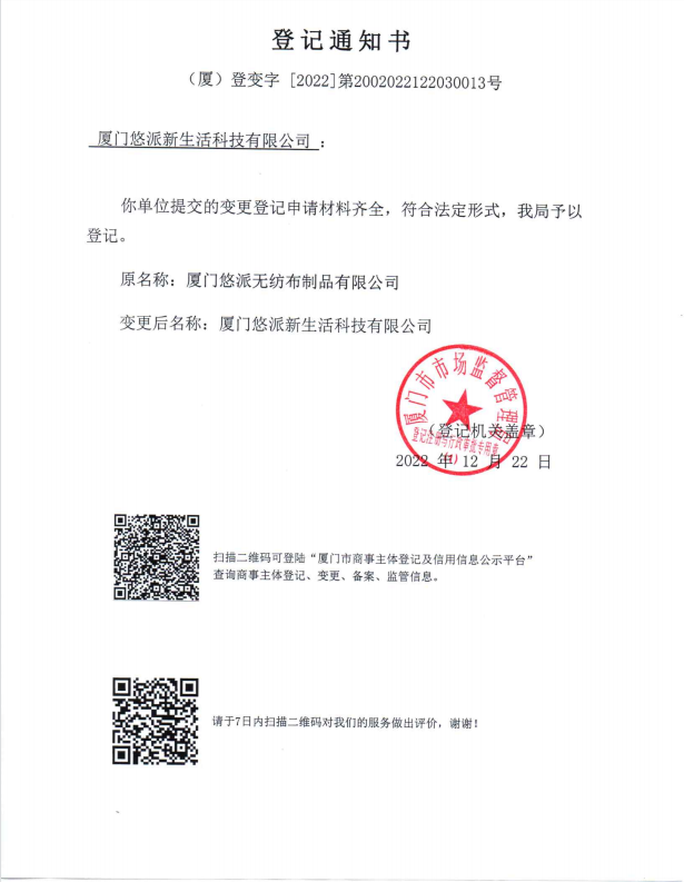 為進(jìn)一步適應(yīng)企業(yè)發(fā)展戰(zhàn)略的需求,經(jīng)廈門市市場(chǎng)監(jiān)督管理局行政核準(zhǔn),“廈門悠派無(wú)紡布制品有限公司”正式更名為“廈門悠派新生活科技有限公司”。更改公司名稱將不會(huì)影響合作伙伴的任何權(quán)益及公司日常業(yè)務(wù)的運(yùn)營(yíng)。